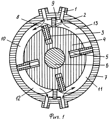 Рабочая среда через каналы 1 подвода поступает в межсегментную полость и дальше в рабочие полости 10, 11, производя вращение ротора. В это время из полостей 12, 13 идет выпуск отработанной рабочей среды. Когда рабочая пластина 3 проходит через сегменты пазы ротора 4 сообщены с межсегментной полостью через радиальные прямые сквозные каналы 8. Поэтому рабочая пластина 3 при входе и выходе из паза ротора 4 преодолевает только сопротивление вязкости рабочей среды. После прохождения сегмента рабочая пластина 4 прижата к статору 7 только силой пластинчатой пружины 5. Радиальные прямые сквозные каналы 8 рабочей пластины 4 закрываются, паз ротора 4, рабочие полости разъединяются, идет рабочий ход.