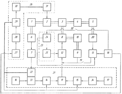 Срабатывание датчика соответствует началу работы системы. В этом исходном положении задатчик 5 постоянно воздействует на датчик 20, а на второй исполнительный механизм 9 через второй электронный ключ поступает напряжение для срабатывания ограничителя хода 10 органа 3 управления топливоподачей.