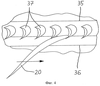 Более наглядное представление об аэродинамическом профиле и кривизне направляющих элементов 37 позволяет получить показанная на фиг.4 проекция, где в дополнение к фиг.3 показан профиль лопаток рабочего колеса 20 вместе с направлением его вращения (обозначенным стрелкой). Для специалиста представляется очевидным, что на выходе из кольцевой камеры 29 в зоне ее передней по ходу потока кромки 35 рециркуляционный поток в этом случае должен закручиваться против вращения рабочего колеса 20. Позицией 36 обозначена задняя по ходу потока кромка кольцевой камеры.