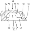Показанное на фиг.7 рециркуляционное устройство 51 отличается от рассмотренных выше вариантов его выполнения тем, что в передней и задней частях направляющих элементов 56 предусмотрены полностью замкнутые по своему периметру отверстия 58, 59, обеспечивающие возможность движения потоков в кольцевой камере 53 в ее окружном направлении. Тем самым в этом варианте остаются повышающие прочность направляющих элементов 56 перемычки 60, 61, прочно соединяющие их с передней и задней стенками 54, 55 кольцевой камеры 53, выполненной в корпусе 52 турбокомпрессора. В другом варианте вместо одного из отверстий 58, соответственно 59 можно предусмотреть описанную выше выемку, образованную за счет выполнения направляющих элементов с отступом от соответствующей стенки кольцевой камеры 53. Очевидно, однако, что в направляющих элементах можно предусмотреть и лишь по одному отверстию 58, соответственно 59 в их передней или задней части.