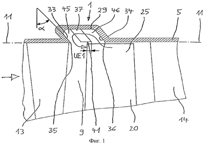 Угол наклона передней стенки обозначен через и может равняться углу наклона задней стенки 34 либо отличаться от него. Между передней стенкой 33, направляющими элементами 37 и задней стенкой 34 предусмотрены выемки 45, 46, которые в дополнение к происходящей преимущественно в осевом направлении рециркуляции потоков допускают их движение в кольцевой камере в ее окружном направлении. Позицией 25 обозначены свободные концы лопаток рабочего колеса 20, в зоне которых наиболее вероятно возникновение возмущений в потоке. Участок взаимного осевого перекрытия направляющих элементов 37 и концов 25 лопаток обозначен на фиг.1 через UE1.