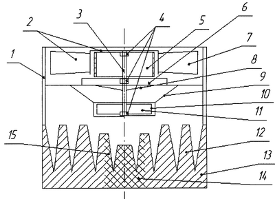 На чертеже представлена схема устройства для удаления тепла, включающего корпус 1, в котором помещен осевой вентилятор 2, установленный на оси 3 электродвигателя (не показан), которая вращается на подшипниках 4 внутри статора 5, установленного на плате схемы управления 6, лопасти 7 осевого вентилятора 2 вращаются вокруг статора 5. Снизу платы схемы управления 6 установлены обтекатель 8 с элементами крепления 9, корпус 10 дополнительного осевого вентилятора с лопастями 11, расположенного на удлиненной оси электродвигателя (не показан). Корпус 1 основного осевого вентилятора 2 совмещен с радиатором 13, имеющим ребра 12. Участок 14 в центральной части радиатора 13 с ребрами 15 различной высоты выполнен из материала повышенной теплопроводности.