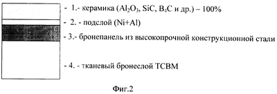 Поставленная задача решается, а технический результат достигается за счет того, что создается новая композиционная система бронепреграды (фиг 2), состоящая из четырех слоев: лицевого высокотвердого слоя керамики толщиной 1,5±0.2 мм одного из материалов: оксид алюминия – Al2O3, карбид кремния – SiC, карбид бора – B4O (1), подслоя, состоящего из пластичного и вязкого никель-алюминиевого (Ni+Al) сплава толщиной 0,1-0,15 мм (2), бронепанели из высокопрочной конструкционной стали (3) и тканевого бронеслоя из ткани ТСВМ (4).