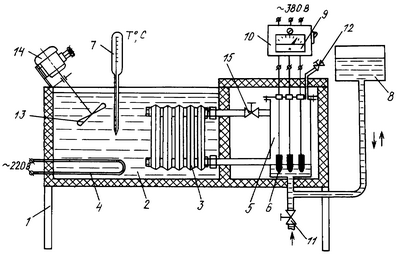 В установке исследуемый образец с загрязненной поверхностью (например, теплообменник системы отопления) закрепляется с помощью накидных гаек в испытательной ванне 2. Испытательная ванна заполняется жидкостью (водой), которая нагревается при помощи нагревателя 4. Электродный парогенератор, соединенный с испытуемым образцом 3 напорным и обратным трубопроводами и образующий замкнутую систему, заполняется технической водой (с определенным коэффициентом электропроводности ) через вентиль 11, причем вентиль 12 и 15 находится в открытом состоянии. После полного вытеснения воздуха водой вентили 11 и 12 закрывают. Включают нагреватель 4 и с помощью электродвигателя 14 осуществляют помешивание воды в испытательной ванне мешалкой 13. О достижении заданного температурного напора судят по термометру 7 и давлению насыщенного пара в замкнутом контуре (используя зависимость температуры от давления насыщенного пара). С помощью пульта управления 10 на электроды 6 подают рабочее переменное напряжение 380 В, в результате чего происходит нагревание воды. При нагреве воды до температуры кипения происходит парообразование, в результате чего вытесненная паром вода вытесняется в расширительную емкость 8. При достижении стационарного режима, при котором осуществляется баланс между создаваемой парогенератором 5 и потребляемой исследуемым образцом 3 мощностью, при соответствующем температурном напоре производят отсчет показаний по амперметру 9. Затем закрывают вентиль 15 и при достижении баланса между потребляемой и генерируемой мощностью (о чем свидетельствует неизменное значение потребляемого тока на амперметре 9) снимаются показания холостого хода электродного парогенератора 5. Для определения теплового потока, проходящего через поверхность измеряемого образца, необходимо вычесть значение тока холостого хода из значения тока, потребляемого в стационарном режиме при открытом вентиле 15. Полученная разность, умноженная на напряжение, подаваемое на электроды, и будет соответствовать значению теплового потока (одной фазоветви) загрязненной поверхности образца.