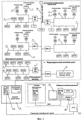 Индивидуальный тепловой пункт (ИТП) 14 служит для оптимизации режима теплоснабжения и горячего водоснабжения при экономном потреблении энергоресурсов, а также коммерческого учета тепловой энергии. На индивидуальном тепловом пункте 14 установлен общедомовой энергии теплосчетчик, который выполнен по ГОСТ Р51649 и служит для учета параметров общедомового потребления. Диспетчерский пункт 19 (общесистемный уровень) содержит компьютер 22 с принтером (на чертеже не показан) и связан через модем 23 с домовым концентратором 13. Он служит для диспетчеризации данных по потребленным ресурсами квартиросъемщиками и домами полностью, хранения часовых, суточных и месячных архивов потребления, актуализации при необходимости содержимого архива с содержимым домовых концентраторов, печати квитанций по потреблению энергоресурсов и мониторинга отказов элементов системы. Диспетчерский пункт 19 связан также с сервером 24 баз данных, который не входит в состав системы и служит для обмена данными с сервисными службами города.