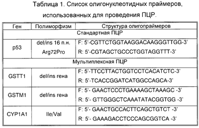 В заявляемом изобретении предлагается новый модифицированный вариант идентификации аллелей генов, ассоциированных с онкозаболеваниями, путем использования набора олигопраймеров и температурного режима, позволяющих проводить мультиплексную полимеразную цепную реакцию и стандартную полимеразную реакцию для определения сразу 2-х полиморфизмов одного гена, причем модифицированную таким образом, что появляется возможность проводить анализ гаплотипов по данному гену (ген р53).