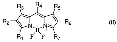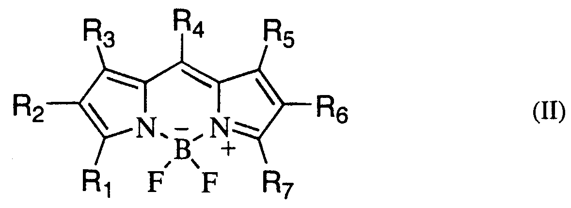 Длины волн спектра поглощения и испускания красителей на основе дифторида дипиррометенбора обычно могут меняться при замене заместителей хромофора. Удлинение цепи -электронного сопряжения ведет к сдвигу полос испускания и поглощения к большим длинам волн. Удлинение цепи -электронного сопряжения также влияет на светостойкость, растворимость и квантовый выход флуоресценции. US 5274113, US 5451663 и WO 93/09185 описывают агенты мечения на основе дифторида дипиррометенбора, которые имеют пик поглощения между 525 нм и 650 нм. Такой сдвиг в длине волн поглощения и испускания достигали путем добавления ненасыщенной органической группы в хромофор. Указанные патенты описывают использование арильного, гетероарильного и алкенильного заместителей для удлинения цепи -электронного сопряжения. US 5248782 описывает красители на основе гетероарил-замещенного дифторида дипиррометенбора, а US 5187288 описывает красители на основе этенил-замещенного дифторида дипиррометенбора, которые имеют пик поглощения между 550 и 670 нм. Сдвиг в длине волн поглощения и испускания в большинстве случаев сопровождался повышением коэффициента поглощения и светостойкости. Удлинение цепи -электронного сопряжения также описано Chen J. et al., J.Org.Chem., 65 (2000) 2900. Chen J. et al. описывают красители на основе арил-замещенного дифторида дипиррометенбора, которые имеют пик поглощения между 620 и 660 нм и эмиссию флуоресценции между 630 и 680 нм. US 5433896 описывает красители на основе дифторида дипиррометенбора, содержащие конденсированные арильные заместители. Такие красители на основе дифторида дипиррометенбора имеют пик поглощения и испускания между 600 нм и 740 нм. Молярный коэффициент поглощения красителей на основе дифторида дипиррометенбора часто выше 100000 см-1М-1.