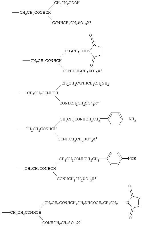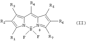 где R1 представляет собой замещенную или незамещенную фенильную, 2-тиенильную, 2-пирролильную или фенилэтенильную группу; группы R2, R3, R4, R5, R6 или R7 каждая независимо является водородом или замещенной или незамещенной алкильной группой и, по меньшей мере, одна из групп R2, R3, R4, R5, R6 или R7 является замещенной для получения химически активной группы, выбранной из группы, включающей карбоновую кислоту, реакционноспособный эфир карбоновой кислоты, ангидрид карбоновой кислоты, малеимид, амин и изотиоцианат; и, по меньшей мере, одна из групп R1, R2, R3, R4, R5, R6 или R7 является замещенной для получения группы, придающей водорастворимость, выбранной из группы, включающей соль аммония или щелочного металла сульфоновой или карбоновой кислоты.