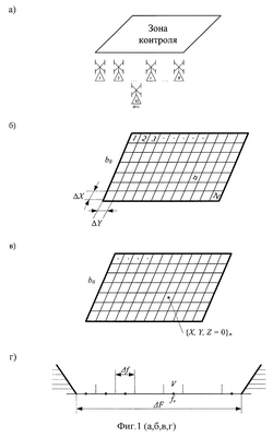 Реализация заявляемого способа поясняется следующим образом. На подготовительном этапе выполняются следующие операции. Заданную зону контроля, в рамках которой определяется местоопределения ИРИ (см. фиг.1а), делят на элементарные зоны привязки (см. фиг.1б). Размеры элементарной зоны привязки так же, как и в прототипе, соответствуют предварительно заданной точности местоопределения { Х, Y}. На следующем этапе находят географические координаты центров элементарных зон привязки {X, Y}n и присваивают каждой из них порядковый номер b0,n (см. фиг.1б, в) из набора n=1, 2, …, N. Далее осуществляют разбиение пространства над зоной контроля на Н слоев. Толщина слоя Z соответствует предварительно заданной точности местоопределения ИРИ в пространстве над зоной контроля, например 100 м. Каждому сформированному пространственному слою присваивается порядковый номер h, h=1, 2, …, Н. Значение Н определяется заданной максимальной высотой оцениваемого пространства над зоной контроля и точностью оценивания координат ИРИ в вертикальной плоскости Z (см. фиг.1д).