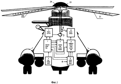 В режиме обнаружения наземных препятствий РЛС работает следующим образом. При работе двигателя вертолета производится вращение лопастей с антенными решетками 20 и 21 в круговом секторе.
