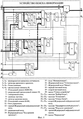 1. Устройство поиска информации, содержащее N формирователей временных интервалов, где N 1, N блоков селекции, делитель частоты, вход которого является тактовым входом устройства, отличающееся тем, что дополнительно введены N регистров временного хранения, N двухвходовых элементов И, разрешающий трехвходовый элемент И, N-входовый элемент ИЛИ-НЕ, электронный ключ, регистр хранения маски, N-входовый элемент И-НЕ, блок управления, при этом выход делителя частоты соединен с тактовыми входами формирователей временных интервалов, соответствующие разряды К-разрядных входов “Код времени хранения”, где К 1 – разрядность кода времени хранения, формирователей временных интервалов соединены между собой и являются соответствующими разрядами К-разрядного входа “Код времени хранения” устройства, разрешающие входы N формирователей временных интервалов и первый вход разрешающего трехвходового элемента И соединены между собой и являются разрешающим входом устройства, соответствующие разряды М-разрядных информационных входов, где M 1 – количество двоичных разрядов анализируемого блока информации, N регистров временного хранения, N блоков селекции и электронного ключа соединены между собой и являются соответствующими разрядами первого М-разрядного информационного входа устройства, входы “Инициализация” N формирователей временных интервалов и регистра хранения маски соединены между собой и являются входом инициализации устройства, выход разрешающего трехвходового элемента И подключен к входам “Разрешение” формирователей временных интервалов, электронного ключа и является выходом “Разрешение” устройства, i-й выход “Выбор блока”, где i=1, 2…N, блока управления соединен с входом “Выбор блока” i-го формирователя временных интервалов, выход i-го двухвходового элемента И соединен с i-м входом N-входового элемента ИЛИ-НЕ и входом “Результат сравнения” i-го формирователя временных интервалов, выход “Установка” i-го формирователя временных интервалов соединен с входом “Установка” i-го регистра временного хранения, выход “Статус блока” i-го формирователя временных интервалов соединен с вторым входом i-го двухвходового элемента И, i-м входом блока управления и i-м входом N-входового элемента И-НЕ, выход N-входового элемента И-НЕ подключен к третьему входу разрешающего трехвходового элемента И и является выходом “Статус устройства” устройства, разряды М-разрядного входа “Установка маски” регистра хранения маски являются соответствующими разрядами М-разрядного входа “Установка маски” устройства, а разряды М-разрядного выхода регистра хранения маски подключены к соответствующим разрядам М-разрядных входов “Маска” N блоков селекции, М-разрядный выход i-го регистра временного хранения подключен ко второму М-разрядному информационному входу i-го блока селекции, выход “Предварительный результат” i-го блока селекции подключен к первому входу i-го двухвходового элемента И, выход N-входового элемента ИЛИ-НЕ подключен к второму входу разрешающего трехвходового элемента И, а М-разрядный информационный выход электронного ключа является М-разрядным информационным выходом устройства.
