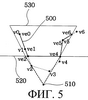 Отсечение линии обычным способом выполняют с шести сторон, т.е. по плоскости проекции и верхней, нижней, левой, правой и задней сторонам отображаемого объема. Например, как показано на фиг.5, для линии 500, состоящей из семи узлов v0, v1, v2, v3, v4, v5 и v6, координаты точек пересечения ve2, ve4 и ve6 линии 500 с шестью сторонами, включая плоскость проекции 520 и верхнюю, нижнюю, левую, правую и заднюю стороны отображаемого объема 530, если смотреть из центра проекции 510, рассчитывают для формирования линии с новой структурой, состоящей из ve0(v0), ve1(v1), ve2, ve4, ve5(v5) и ve6.