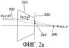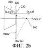 Кроме того, когда линию проецируют на плоскость проекции, узлы линии, находящиеся позади центра проекции 100, проецируются обратно в направлении, противоположном ожидаемому. Таким образом, они должны быть удалены посредством отсечения линии. Т.е., как показано на фиг.2а, если линию 220, находящуюся внутри границы отображаемого объема 210 при наблюдении из положения центра проекции 200, проецируют на плоскость проекции 230, она проецируется как линия 240 на плоскость проекции 230. Однако, как показано на фиг.2b, если с одной стороны узел линии 220 с координатами (x, у, z) находится позади положения центра проекции 200, координаты (x, у, z) узла проецируются как спроецированные координаты (xp, уp) на плоскость проекции 230, что приводит к появлению ошибки, при которой линия 220 проецируется как неправильная линия 240а на плоскость проекции 230.