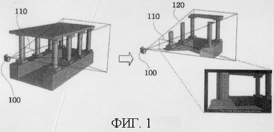 Обычная обработка трехмерной графики включает операцию отсечения для отсечения части трехмерного изображения, которая не предназначена для отображения на экране. Например, как показано на фиг.1, отсечение выполняют для удаления данных для тех частей трехмерного изображения, которые находятся вне границ отображаемого объема 120, если смотреть на трехмерное изображение из положения центра проекции 100, как точки обзора, если данные части трехмерного изображения размещены внутри границ отображаемого объема 120, т.е. внутри шести плоскостей, включающих плоскость проекции 110 и выше, ниже, левее, правее и сзади отображаемого объема 120, проецируют на плоскость проекции 110. Это позволяет уменьшить объем данных, для обработки трехмерного изображения, в связи с чем уменьшается объем вычислений и повышается скорость обработки.