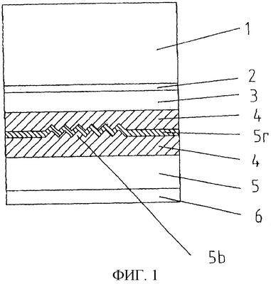 В варианте выполнения по фиг.4 речь идет о теле, состоящем из различных слоев накрывающих (внешних) пленок и входных слоев. Верхняя накрывающая пленка на своей нижней стороне имеет слоистую структуру, состоящую из слоя 5с лака, отражающего слоя 5r, чувствительного к лазерному излучению слоя 4, фонового слоя 5 и клеящего слоя 6. В слое 5с лака, отражающем слое 5r и чувствительном к лазерному излучению слое 4 выполнена дифракционная и/или голограммная структура 5b.