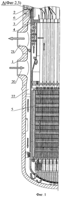 Сосуд 1 (фиг. 1) снабжен входным патрубком 20 и выходным патрубком 21 и образует со стенкой опорного цилиндра 4 опускной канал 22 контура циркуляции теплоносителя в реакторе.