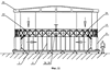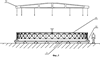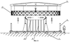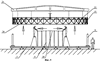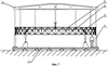 Далее после установки всех телескопических стоек (8) и прокладки несущих нитей верхней сети (26) проводится натяжение армирующих нитей с заданным усилием. Натяжение нити создается с помощью тарированных грузов, подвешенных к ее концам. Затем проводится закрепление пересекающихся несущих нитей верхней сети (26) в узловых точках формируемой сети, например, с помощью нитей и клея, или механически, с помощью обжимных приспособлений.