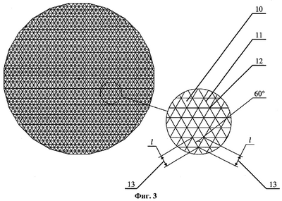 Грань сети (10) представляет собой равносторонний треугольник (фиг.3), сторонами которого являются отрезки несущей нити сети (11), заключенные между узловыми точками сети (12). Длина стороны (l) грани сети (10) выбирается в зависимости от требуемого размера космического рефлектора, ограничением является получение заданной точности отражающей поверхности рефлектора.
