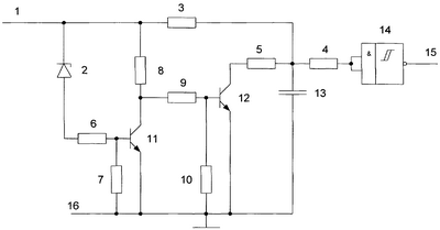 Шина 1 питания подключена к катоду стабилитрона 2, к первому выводу резистора 8 и через последовательно соединенные первый 3 и второй 4 резисторы – к первому входу триггера Шмитта 14, второй вход которого объединен с его первым входом, а выход подключен к выходной шине 15. Анод стабилитрона 2 через резистор 6 подключен к базе транзистора 11, коллектор которого подключен к второму выводу резистора 8 и через резистор 9 – к базе транзистора 12, коллектор которого через резистор 5 подключен к точке соединения первого 3 и второго 4 резисторов и к первому выводу конденсатора 13, второй вывод которого объединен с эмиттерами транзисторов 11, 12 и подключен к общей шине 16. Базы транзисторов 11 и 12 через резисторы 7 и 10, соответственно, подключены к общей шине 16.