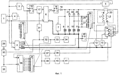 Одновременно, передний фронт сформированного прямоугольного строб-импульса длительности э с выхода цифрового таймера 30 через элемент гальванической развязки 31 поступает на управляющий вход третьего ключа 17 и открывает его на время э (фиг.2, поз.42). При этом напряжение постоянного тока (+U1) с плюсового вывода выхода схемы выпрямителя 6, через первый диод 19 поступает на первый вывод первого накопительного конденсатора 8, заряжая его в течение времени ta до напряжения Uc (фиг.2, поз.48), которое контролируется индикатором напряжения 7.