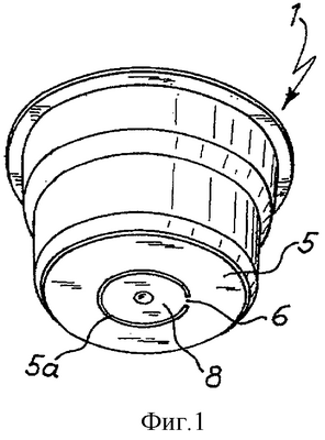 Как указывалось выше, патрон 1 выполнен из деформируемого материала, обычно изготовленного из пластмассового материала, например гомополимера или сополимера этилена или пропилена, пригодных для использования с пищевыми продуктами. Предпочтительный материал имеет кристалличность свыше 75% и процентное содержание аморфного полимера, обеспечивающее вязкоупругую деформацию стенки основания патрона во время подачи под давлением горячей воды. Понятие «вязкоупругая деформация» означает, что деформация материала стенки основания, по меньшей мере, в зоне вокруг кромки отверстия на стенке 5 основания вдоль линии 5а уменьшается или почти исключается в конце дозирования или в одной или нескольких фазах во время дозирования. Другими словами, во время всей фазы разлива с дозированием напитка материал стенки основания, по меньшей мере, в указанном окружении выходного отверстия противостоит деформации, вызванной водой или другой жидкостью, подаваемой под давлением в патрон. Таким образом, величина деформации и тем самым размеров выпускного канала 10 является управляемой во время разлива напитка. Технологию формования материала можно выбирать так, чтобы по возможности сохранять процентное содержание аморфного полимера в конечном изделии. Подходящие материалы выбираются из (со)полимеров этилена и пропилена, например: (со)полимеров пропилена, содержащих один или более альфа-олефинов, имеющих 2-10 атомов углерода, например 1-бутен, 1-пентен, 4-метил-1-пентен, 1-гексен, 1-октен; композиций полипропилена, полученных посредством последовательной полимеризации пропилена и его смесей с этиленом и/или альфа-олефинами. (Со)полимеры обычно имеют индекс расплава между 0,2 и 60 при 230°С/21,6 Н.