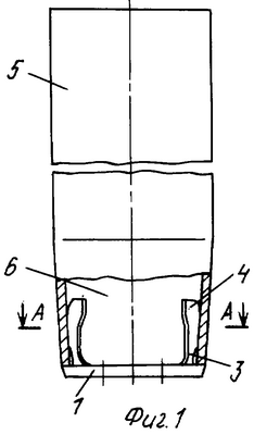 Поскольку в свободном состоянии расстояние между верхними участками незакрепленных частей 4 оппозитно расположенных пружинящих элементов 3 превышает диаметр отверстия канала 6, незакрепленные части 4 элементов 3 предварительно сжимают до положения, при котором указанные части элементов 3 смогли бы свободно войти в отверстие канала 6.
