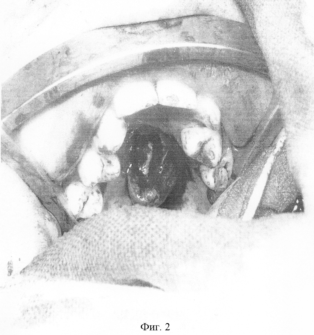 Скальпелем освежены края небного дефекта. Мобилизованный отдел нижней носовой раковины смещен в дефект неба и фиксирован в передних и средних отделах швами без натяжения слизистой оболочкой в полость рта. Костная основа носовой раковины установлена в горизонтальное положение (фиг.2). Повязка с иодоформом на швы в полости рта. Мазевая передняя тампонада в полость носа.