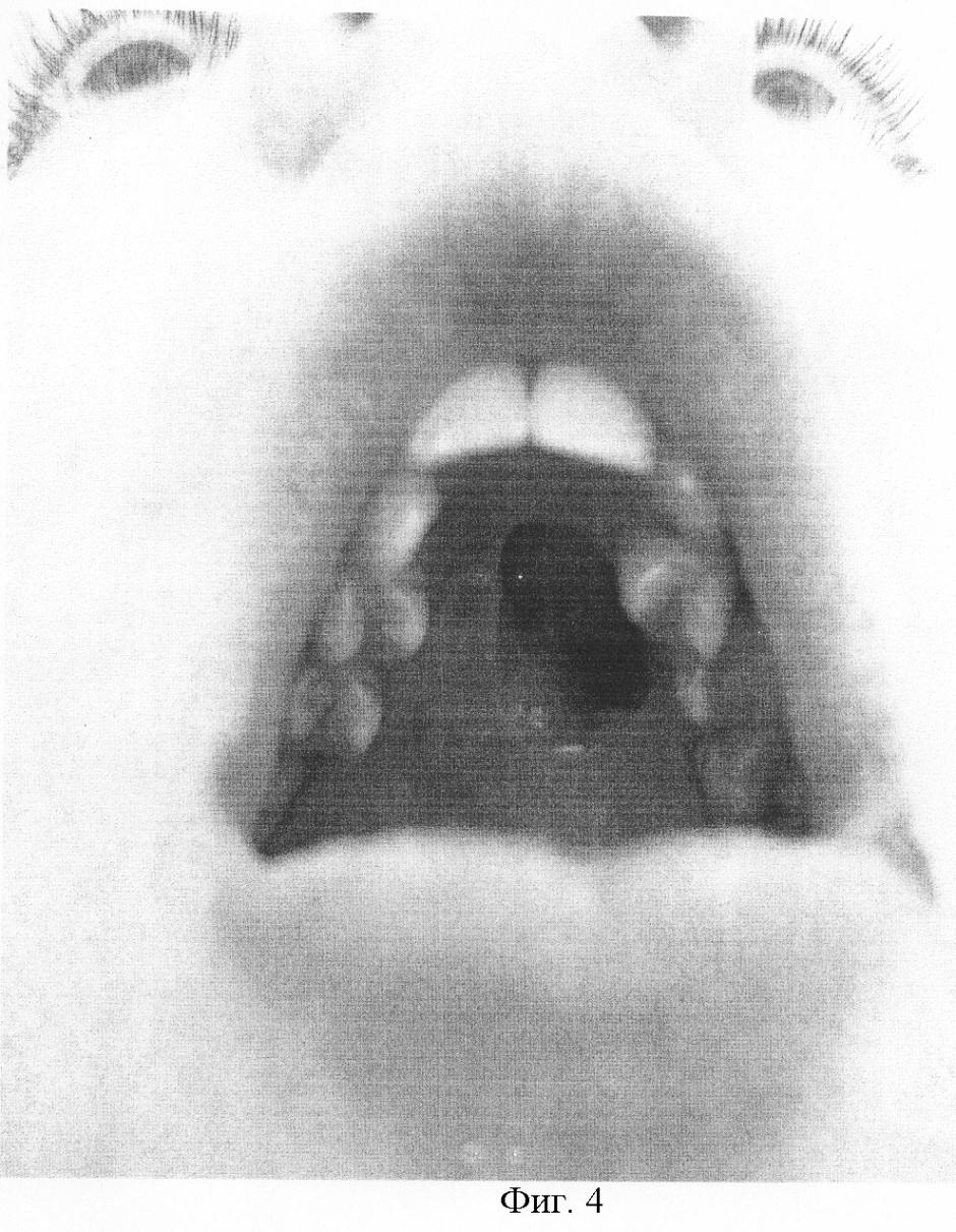 Результаты лечения показали, что наступило разобщение в послеоперационном периоде носовой и ротовой полостей, улучшение носового дыхания. Это привело к улучшению функциональных результатов лечения за счет восстановления функции питания и речи, что позволило полностью реабилитировать пациента (фиг.3).