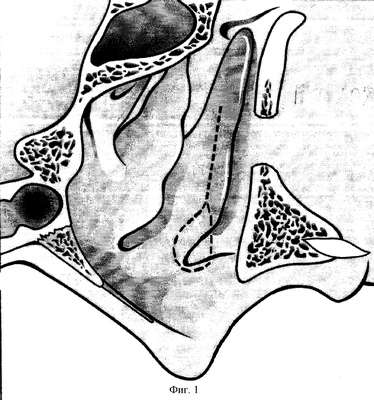 1 этап: скальпелем рассекается слизистая у переднего конца нижней носовой раковины, и кзади, отступив от основания 2-3 мм до кости. Тонким долотом мобилизуется вся раковина, оставаясь фиксированной к латеральной стенке полости носа в задних отделах (сосудистая ножка согласно топике кровоснабжения) (фиг.1).