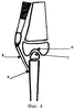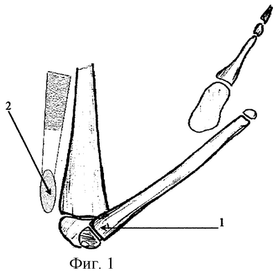 Третьим этапом из разреза по передней поверхности нижней трети бедра и верхней трети голени выделяется эпифиз бедра. По его нижней поверхности формируется хрящевой лоскут, который отгибается, и под ним в губчатой костной ткани формируется углубление (фигура 4, позиция 6), на дно которого укладывается хрящевой лоскут. Затем мобилизуется головка малоберцовой кости и внедряется в созданное углубление (фигура 4, позиция 7) и временно (на срок 6 недель) фиксируется продольной интрамедуллярной спицей к бедренной кости в положении полного разгибания. Надколенник, не имеющий собственной связки (фигура 1, позиция 2), мобилизуется. Из окружающих его плотных фасциальных образований создается лоскут, который подшивается к нижнему полюсу надколенника и проксимальному метафизу малоберцовой кости (фигура 4, позиция 8) для выполнения функции собственной связки надколенника. Рана зашивается.