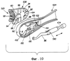 Как видно из фиг.9, электрическая зубная щетка содержит головку зубной щетки 420, корпус или ручку 422 и продолговатую шейку 424 между ними. Приводной механизм, который состоит из валов и шестерен, которые передают движение с двигателя на первый держатель 36 щетинок, является аналогичным тому, который описывается в патенте США №6178579, сущность которого включается в настоящее описание в качестве ссылки. Ручка 422 является полой и содержит двигатель 426 и батарейки (не показаны) для питания двигателя. Вместо батареек может быть использован перезаряжаемый источник питания. Головка 420 имеет продольную ось 430, проходящую через нее. Продольная ось 430 проходит в том же общем продольном направлении, что и продольная ось 432 вала 434. Первый держатель 36 щетинок располагается на первом конце головки 420, причем первый конец находится на самой передней точке головки 420. Хотя первый держатель 36 щетинок показан как имеющий круглую форму, могут использоваться и другие формы. Кроме того, хотя первый держатель 36 щетинок располагается на первом конце головки 20, будет понятно, что она может быть удалена от первого конца, и другие детали, такие как стационарные щетинки, могут располагаться между первым держателем 36 щетинок и первым концом головки 20. В этом варианте выполнения первый держатель щетинок совершает только угловые колебания и не совершает возвратно-поступательного движения, поступательного движения, или какого-либо другого движения, не являющегося ни вращательным, ни колебательным.