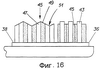 Хотя электрические зубные щетки согласно настоящему изобретению могут быть изготовлены с любым сочетанием типов, размеров, комбинаций, углов и расположений щетинок или массажных насадок, особенно предпочтительная система показана на фиг.16 и 17. Первый держатель 36 щетинок имеет два концентрических кольца из пучков, где наружное кольцо 39 имеет 10-20 пучков, и внутреннее кольцо 41 имеет 6-10 пучков. В одном из вариантов выполнения внешнее кольцо 39 имеет 14 пучков, и внутреннее кольцо 41 имеет 8 пучков. От 1 до 2 пучков располагаются внутри внутреннего кольца 39, в центре первого держателя щетинок. Пучки внешнего кольца 39 имеют различную высоту. В одном из вариантов выполнения имеются семь высоких пучков 43 и семь более коротких пучков 45. Разница в длине между высокими пучками 43 и более короткими пучками 45 находится в пределах между примерно 0,5 мм и примерно 2,5 мм в одном примере и между примерно 1 мм и примерно 2 мм в другом примере. Могут предусматриваться высокие и короткие пучки щетинок с различными характеристиками. Например, высокие пучки щетинок могут быть относительно мягкими для легкой очистки и массажа десен пользователей, в то время как более короткие пучки щетинок могут быть несколько тверже для очистки областей между зубами (или наоборот). Эта система позволяет более длинным (и, как правило, более мягким щетинкам) сжиматься, изгибаться и отклоняться по отношению к деснам пользователя до того, как более короткие (и, как правило, более твердые щетинки) вступят в контакт с зубами и деснами пользователя. По этой причине, например, мягкие щетинки могут применяться при большем усилии, в то время как более жесткие (и возможно, менее комфортные щетинки) применяются при меньшем усилии.
