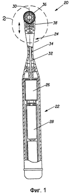 Ручка является полой и содержит двигатель 26 и батарейки 28 для питания двигателя. Вместо батареек может быть использован перезаряжаемый источник питания. Головка 20 имеет продольную ось 30, проходящую через нее. Продольная ось 30 проходит в том же общем продольном направлении, что и продольная ось 32 вала 34. Вал 34 заключен, по меньшей мере, частично, внутри шейки 24. Первый держатель 36 щетинок располагается на первом конце головки 20, причем первый конец находится в самой передней точке головки 20. Хотя первый держатель 36 щетинок показан как имеющий круглую форму, могут использоваться и другие формы. Кроме того, хотя первый держатель 36 щетинок располагается на первом конце головки 20, будет ясно, что он может быть удален от первого конца, и другие детали, такие как стационарные щетинки, могут располагаться между первым держателем 36 щетинок и первым концом головки 20. Первый держатель 36 щетинок содержит, по меньшей мере, одну щель для размещения самого удаленного конца вращающегося вала 34, как описано в патенте США 5625916, сущность которого включается в настоящее описание в качестве ссылки. Наиболее удаленный конец вала 34 изогнут или находится на некотором расстоянии от продольной оси 32 вала 34 и зацепляется с пазом для придания первому держателю 36 щетинок угловых колебаний вокруг штифта (не показан). Другими словами, первый держатель 36 щетинок совершает угловые колебания вокруг оси, приблизительно перпендикулярной продольной оси 30, 32 головки 20 и/или вала 34. В этом варианте выполнения первый держатель щетинок совершает только угловые колебания и не совершает возвратно-поступательного движения, поступательного движения или какого-либо иного невращательного движения.