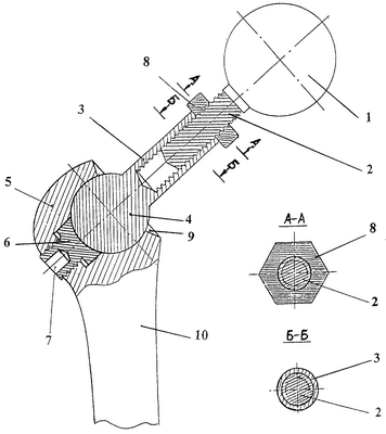 Сущность устройства-прототипа заключается в том, что его головка посредством резьбовой шейки связана со сферическим телом, размещенным в ответной формы полости вертельного отдела. Сферическое тело допускает возможность коррекции всех видов девиации шейки, а оснащенная резьбой шейка путем вращения в резьбовом канале сферического тела, перемещаясь вдоль собственной оси, обеспечивает возможность изменения длины шейки, т.е. латерализации диафиза при возникающей необходимости.
