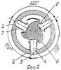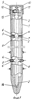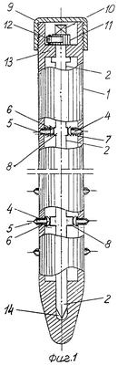 Головки 6 посредством спиральных пружин сжатия 7 поджаты к боковым поверхностям трехлопастных толкателей 8, имеющих форму эвольвенты. Толкатели 8 размещены на стержне 2 равномерно поярусно и противолежат отверстиям 3 трубки 1. В исходном положении головки 6 поджаты к участкам лопастей толкателей 8, наиболее приближенным к стержню 2, а в рабочем – к концевым, наиболее удаленным от стержня, отделам лопастей. Направление вращения толкателей в рабочем положение показано стрелкой. В верхнем отделе трубка 1 оснащена наружной резьбой, на которую навинчен колпачок 9, закрывающий трубку. Верхний конец 10 стержня 2 имеет граненое сечение под ключ. Ниже граненого участка 10 на стержне 2 установлено храповое колесо 11, взаимодействующее с собачкой 12, закрепленной на торцовой поверхности гладкостенного циркулярного прилива 13. Нижний конец стержня 2 установлен в направляющем канале 14 с возможностью вращения вокруг оси в направлении, допускаемом храповым механизмом, состоящим из храпового колеса 11 и собачки 12.