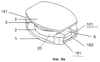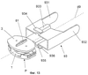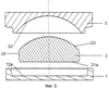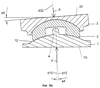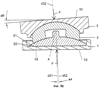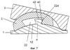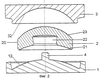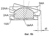 В варианте, показанном на фиг.3, нижняя поверхность (21а) сердечника (2) может быть главным образом плоской, поэтому скольжение по контактной поверхности (12а) нижней пластины (1) также происходит главным образом по плоскости. В этом варианте плоскостность контактной поверхности (12а) нижней пластины позволяет получить выступающие из этой пластины кромки (112), которые являются особенно эффективными для выполнения функции кольцевого ограничителя. Поэтому можно обойтись без центрального ограничителя и, следовательно, увеличить площадь общей контактной поверхности между нижней пластиной и сердечником, что, с одной стороны, уменьшает износ деталей и, с другой стороны, риск образования царапин на поверхности пластины за счет контура выемки (22, фиг.6а), в которую входит центральный ограничитель (4, фиг.6а), существующий в других вариантах.