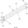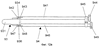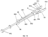 Такой инструмент (94) для установки направляющей показан на фиг.12а и 12b. Этот инструмент (94) содержит две удлиненные трубки (941, 946), которые могут поворачиваться друг относительно друга при помощи средства (945), расположенного у одного из концов инструмента, называемого соединительным. Каждая из указанных двух удлиненных трубок у второго конца, противоположного соединительному, имеет средство блокировки для направляющей (93) ввода. Это средство блокировки может иметь, например, крючок (942, 947) на каждой трубке (941, 946), раскрыв которого находится напротив другой трубки. Когда инструмент (94) для установки направляющей приближается к направляющей (93) ввода, движение поворота трубок в направлении друг к другу за счет поворота в шарнире позволяет каждому крючку (942, 947) плотно охватывать Т-образный язычок (934, 936), выступающий из каждой канавки (933, 935) направляющей ввода. Внутри каждой трубки (941, 946) по ее оси имеется стержень (943, 948), который выполнен с возможностью продольного перемещения по трубке при помощи винтовой передачи с маховичком (944, 949). Вращение указанных маховичков вызывает перемещение стержня вперед по трубке до положения, в котором передний конец стержня блокирует язычок (934, 936) направляющей (93) ввода в крючке (942, 947) трубки. Это позволяет достаточно стабильно блокировать направляющую в инструменте для ее установки и позволяет устанавливать указанную направляющую в заданное положение вокруг инструмента для дистракции в непосредственной близости от позвоночного столба.