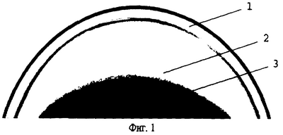 Заявляемый способ поясняется чертежами, на которых представлена гониоскопическая картина шлеммова канала, где на фиг.1 – отсутствие заполнения кровью шлеммова канала (1 – роговица; 2 – шлеммов канал, не заполненный кровью; 3 – радужка), на фиг.2 – заполнение шлеммова канала по всей окружности в виде гомогенной линии (1 – роговица; 2 – шлеммов канал, равномерно заполненный кровью; 3 – радужка), на фиг.3 – заполнение шлеммова канала в виде неравномерно окрашенных сегментов с тенденцией к слиянию (1 – роговица; 2 – шлеммов канал, частично заполненный кровью; 3 – радужка).