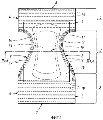 Наружный покрывающий слой 12 может состоять из материала того же типа, что и материал внутреннего покрывающего слоя 11. В качестве средства, предназначенного для повышения степени защиты от утечек, используют не проницаемый для жидкостей, барьерный слой 19, который расположен между абсорбирующим телом и наружным покрывающим слоем 12, как показано на фиг.2b. Может оказаться предпочтительным, если барьерный слой 19 будет иметь некоторую воздухопроницаемость, то есть будет обеспечена возможность прохода водяного пара через слой 19. Не проницаемый для жидкостей барьерный слой 19 может, подобно внутреннему покрывающему слою 11, представлять собой неотъемлемую часть абсорбирующего тела и может состоять, например, из не проницаемой для жидкостей, подобной оболочке поверхности на абсорбирующем пористом материале. Барьерный слой 19 присоединен к подгузнику-трусам, например, посредством склеивания, сшивания или сварки путем использования тепла или ультразвука. Как вариант наружный покрывающий слой 12 может состоять полностью или частично из не проницаемого для жидкостей материала, такого как не проницаемая для жидкостей пластиковая пленка, слой нетканого материала, который был покрыт не пропускающим жидкость материалом, или слой какого-либо другого гибкого материала, который обладает способностью противодействовать проникновению жидкостей.