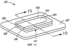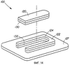 Со ссылкой на фиг.11-14, стабильность пероксида в тонком слое композиции для отбеливания зубов может также быть улучшена путем соответствующего выбора доступной площади поверхности и объема тонкого слоя продукта для отбеливания зубов. Как здесь используется, термин “доступная площадь поверхности” предназначается для определения площади боковой поверхности тонкого слоя композиции для отбеливания зубов (изображенной в качестве примера на фиг.11 под номером 50), которая является непосредственно доступной для верхней части 32 пространства закрытой упаковки 34, в то время как объем относится к объему тонкого слоя композиции для отбеливания зубов. Как здесь используется, фраза “верхняя часть пространства” предназначается для определения пустого объема (то есть, без продукта для отбеливания зубов) упаковки 34. Как площадь поверхности, так и объем для этого отношения могут быть больше, чем площадь поверхности и объем композиции для отбеливания зубов, которая используется в полости рта (и, следовательно, отличаться от величины площади поверхности, используемой для вычисления обсуждаемых выше величин плотности пероксида, дозы пероксида и нагрузки композиции), если существует защитный бортик или какая-либо другая композиция на основе пероксида, размещенная в упаковке, которая не используется в полости рта. Одна из конструкций, имеющая защитный бортик композиции для отбеливания зубов, изображена в качестве примера на фиг.12, 13 и 14. Другие конструкции описываются в заявке на патент США, серийный номер 09/675767, содержание которой включается сюда в качестве ссылки.