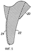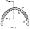 Полоска 12 материала имеет размер для охвата передней или губной/щечной поверхности одного или нескольких зубов, как лучше видно на фиг.4 и 6. В другом воплощении, полоска материала имеет размер для охвата передней поверхности множества зубов, а также, по меньшей мере, некоторой части мягких тканей вблизи этих зубов. Как здесь используется, фраза “мягкие ткани” предназначается для определения одного из краев десен. В другом воплощении, полоска материала имеет размер для охвата передней поверхности множества зубов, по меньшей мере, некоторой части мягких тканей вблизи множества зубов и, по меньшей мере, некоторой части задней или язычной поверхности для множества зубов, как лучше видно на фиг.7. Как правило, полоска материала имеет размер для охвата передней поверхности шести-восьми зубов в верхнем или нижнем рядах зубов, которые видны, когда пользователь улыбается, или либо ряда зубов верхней челюсти, либо ряда зубов нижней челюсти. Необязательно, полоска 12 материала может совпадать с верхним или нижним рядами зубов целиком, когда она располагается на зубах. Наиболее предпочтительно, полоска 12 материала имеет размер для перекрывания с и, кроме того, размер для охвата, по меньшей мере, центральных шести передних зубов (от клыка до клыка). Полоска 12 материала может представлять собой полоску для зубов верхней челюсти, которая является прямоугольной, с закругленными углами, и имеет размеры приблизительно 6,5 см в длину × 1,5 см в ширину, и/или полоска 12 материала может представлять собой полоску для нижней челюсти, которая является трапециевидной с закругленными углами и имеет размеры 5 см в длину × 2 см в ширину. Дополнительное описание размера и формы полоски 12 материала для применения при отбеливании зубов описывается в заявке на патент США, серийный номер 09/278185, поданной 15 марта 1999 года, содержание которой полностью включается сюда в качестве ссылки. Другие формы и размеры полоски материала также могут быть пригодными. Кроме того, предполагается, что настоящее изобретение может применяться в других аппликаторах для отбеливания зубов, таких, как ванночки для отбеливания (например, такие, как описаны в патентах США №№ 5846058; 5816802 и 5895218), постоянно деформируемые полоски (например, такие как те, которые описаны в патенте США № 6045811), и другие предварительно нагружаемые устройства (например, такие как те, которые описаны в патенте США № 5310563), содержание этих патентов включается сюда в качестве ссылок. Полоска материала может иметь множество карманов 18 (фиг.3), которые заполняются композицией для отбеливания зубов.