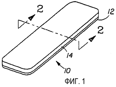 фиг.1 представляет собой общий вид одного из воплощений продукта для отбеливания зубов по настоящему изобретению, содержащего по существу плоскую полоску материала, имеющего композицию для отбеливания зубов, нанесенную на нее в виде покрытия;