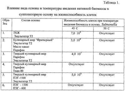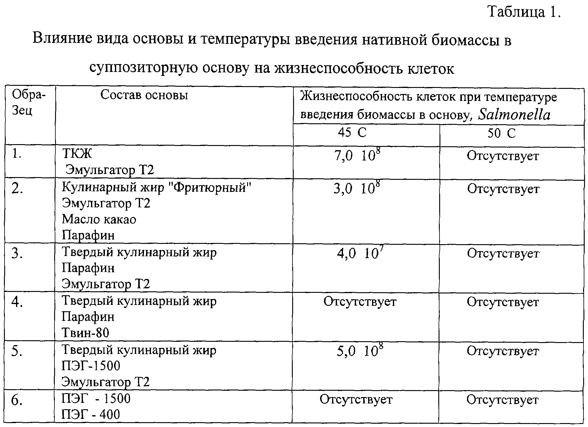 Согласно проведенным исследованиям суппозитории готовят на жировой основе, например с использованием кулинарного жира “Фритюрный” или гидролизованного хлопкового масла (ГХМ), или смеси твердого кулинарного жира, масла какао с добавлением твердого нефтяного парафина и эмульгатора Т-2 путем выливания в суппозиторные формы расплавленной массы, содержащей культуры клеток сальмонелл. Оптимальной температурой введения биомассы в суппозиторную основу является температура 39 – 45°С.