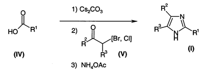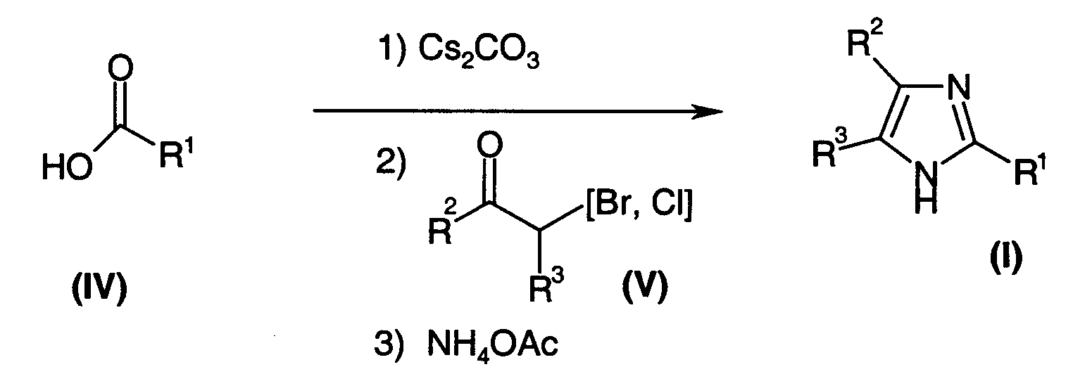 -галогенкетоном общей формулы (V), добавляя далее большой избыток ацетата аммония (например, 15 или 20 эквивалентов на эквивалент кислоты общей формулы (IV)). Данное взаимодействие предпочтительно проводить в смеси ксилолов и при нагревании (можно также, если необходимо, одновременно удалять образовавшуюся при взаимодействии воду).