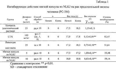 Из приведенной выше таблицы видно, что степени ингибирования для мягкой капсулы из NLKJ по изобретению, 5 мл/кг и 10 мл/кг, p.o., q.d., в течение десяти дней, составляют 20,22% и 44,94%, соответственно; степени ингибирования для лупрона, 0,75 мг/кг и 1,50 мг/кг, s.c., составляют 37,08% и 48,31%, соответственно; в то время как для сочетания мягкой капсулы из NLKJ по изобретению (10 мл/кг, ро×10) с лупроном (1,50 мг/кг, s.c.×1) степень ингибирования составляет 62,92%. Из результатов эксперимента предполагается, что происходит усиление действия при сочетании мягкой капсулы из NLKJ с лупроном. При исследовании также обнаружено, что мягкая капсула из NLKJ по изобретению обладает терапевтическим действием при других заболеваниях предстательной железы, таких как простатомегалия.