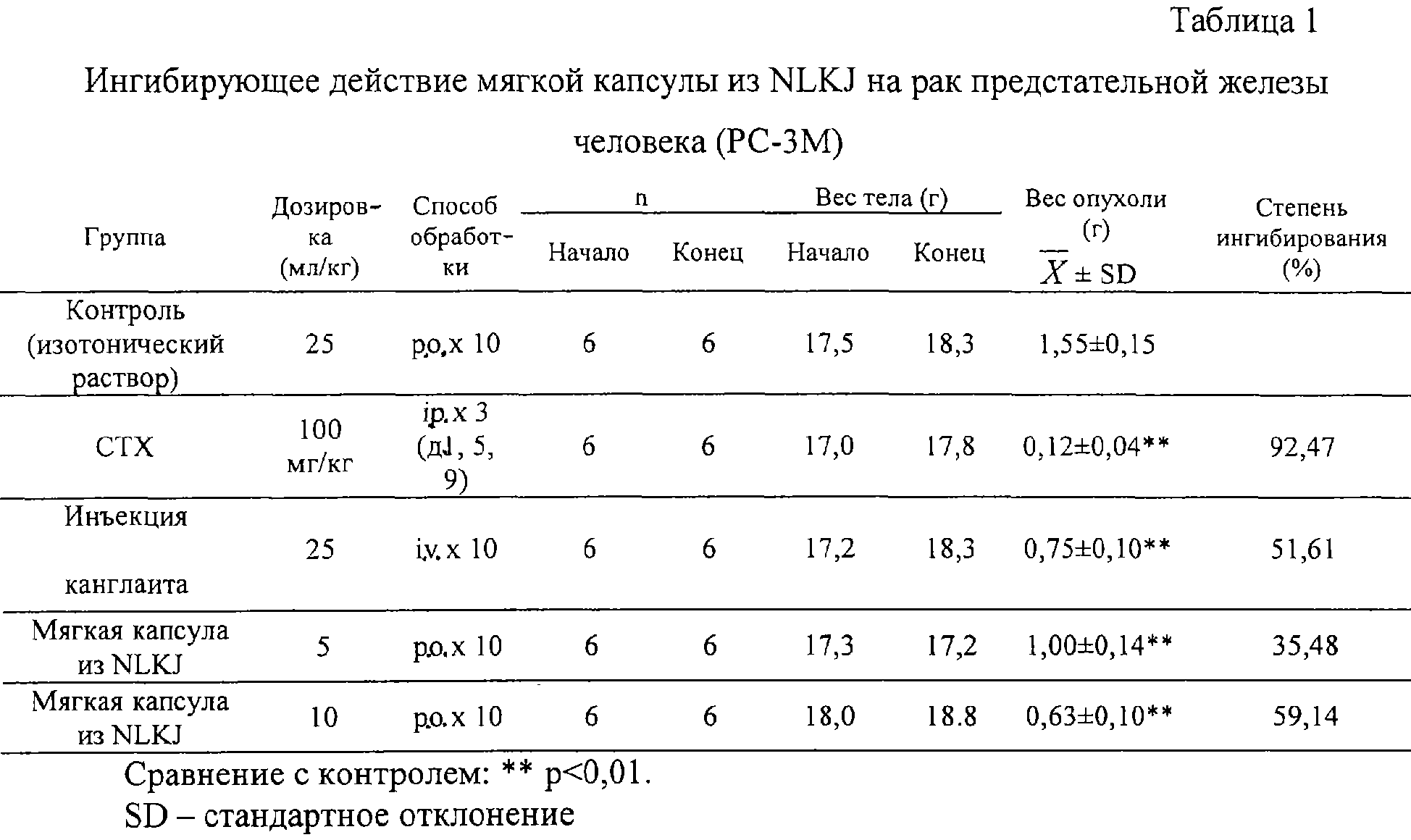 IR – степень ингибирования опухоли; Из табл.1 видно, что в модели на животном мягкая капсула из NLKJ по изобретению (10 мл/кг) оказывает явное действие ингибирования на рост клеток рака предстательной железы. Степень ингибирования достигла 59,14%, что выше, чем в случае инъекции канглаита – 25 мл/кг, i.v. (51,61%). Экспериментальный пример 2 Ингибирующее действие мягких капсул из NLKJ в сочетании с лупроном на рост клеток рака предстательной железы человека в моделях на животных. Экспериментальное лекарственное средство Мягкие капсулы из NLKJ (NLKJ для инъекций), № партии 0011209; лупрон (Takeda Chemical Industries, Ltd., Osaka, Japan 541), № партии 47978 АР. Подопытные животные Самцы голых мышей BALB/C (порода SPF) весом 19-21 г, поставляемые Shanghai Tumor Institute (сертификат качества № 02-30-1 Sh. Med. Anim.). Трансплантируемая опухоль: рак предстательной железы человека (РС-3М), субкультивированный Pharmacological Department, Shanghai Institute of Medical Industries. Экспериментальный метод Вполне образовавшиеся опухоли РС-3М гомогенизировали в изотоническом растворе (1:4). Голым мышам инокулировали подкожно в подмышечную ямку 0,2 мл гомогената на мышь и затем мышей произвольно разбивали на следующие группы: 1) контрольная группа (изотонический раствор); 2) мягкая капсула из NLKJ (5 мл/кг, р.о.×10 д); 3) мягкая капсула из NLKJ (10 мл/кг, р.о.×10 д); 4) лупрон (0,75 мг/кг, s.c.×1); 5) лупрон (1,50 мг/кг, s.c.×1); 6) мягкая капсула из NLKJ (5 мл/кг, р.о.×10 д) + лупрон (0,75 мг/кг, s.c.×1); 7) мягкая капсула из NLKJ (10 мл/кг, р.о.×10 д) + лупрон (1,50 мг/кг, s.c.×1). Мягкие капсулы из NLKJ (NLKJ для инъекции) вводили со второго дня после инокуляции через желудочный зонд один раз в день в течение 10 дней. Лупрон вводили подкожно на второй день после инокуляции. На 21 день после инокуляции животных умерщвляли путем смещения шейных позвонков и вскрывали для извлечения опухолей. Сравнивали вес опухолей в разных группах. Результаты приводятся в табл.2.