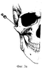 Известен способ обезболивания при оперативных вмешательствах в зоне иннервации верхних задних альвеолярных нервов (Braun H. Die ortliche Betaubung, ihre wissenschaftlichen Grundlagen und praktische Anwendung. – Leipzig. – 1921) путем блокады верхнечелюстного нерва в крыловидно-небной ямке подскуловым проведением иглы (фиг.1). При этом вкол иглы производят в вершине нижнего угла скуловой кости и продвигают иглу внутрь под скуловую кость и вверх, пока она не достигнет верхнечелюстного бугра. Скользя в близком соседстве с костью, игла проникает в крылонебную ямку. На глубине в 5-6 см игла достигает круглого отверстия, после чего вводят 5 мл раствора анестетика).
