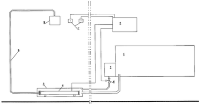 Система пожаротушения работает следующим образом. В исходном состоянии емкости запаса 1 и 2 заполнены исходными компонентами (например, водой и пенообразователем), рабочая капсула 3 «самотеком» заполнена из емкости 1, насос 4 отключен, клапан 6 закрыт. При поступлении на блок управления 5 сигнала от извещателей 7 блок 5 включает насос 4 и открывает клапан 6 (при тушении 2-компонентным огнегасящим составом). Исходные компоненты перемешиваются в рабочей капсуле 3 и подаются насосом 4 к оросителю или генератору пены 8 по трубопроводу 9.