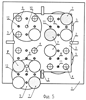 Диаметр игровой площадки 5, боковая поверхность которой должна выходить за пределы игровой панели 3, должен быть таким, чтобы при размещении на одной игровой панели нескольких площадок 5 они не соприкасались между собой, а при их вращении игровые элементы 7, расположенные на одной площадке, не соударялись бы с игровыми элементами, расположенными на другой игровой площадке. Посадочное отверстие 9 игровой площадки должно быть выполнено строго по центру условного квадрата, углы которого являются центрами игровых ячеек 6.