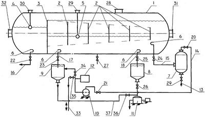 Нефтяная часть, очищенная от воды и механических примесей, переливается через верхнюю кромку перегородки 3, оттуда удаляется через патрубок 16 при открытом запорном кране 22.
